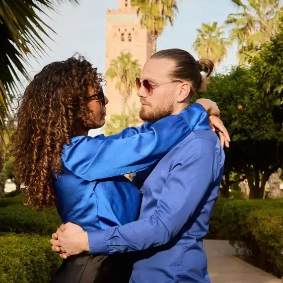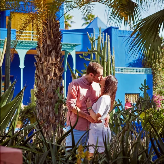 Profitez d’une escale romantique pour vos photos de couple à la Koutoubia ; ses jardins luxuriants et son minaret emblématique constituent la toile de fond indispensable de tout voyage à Marrakech.