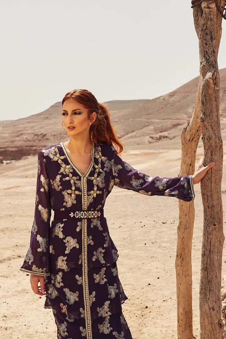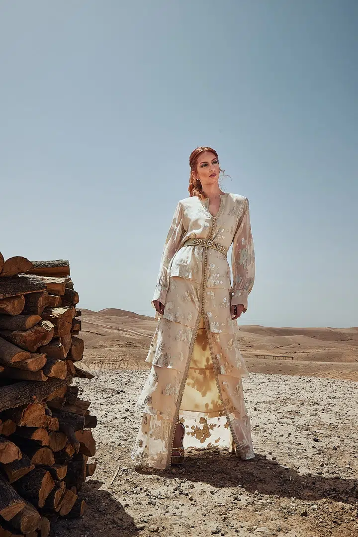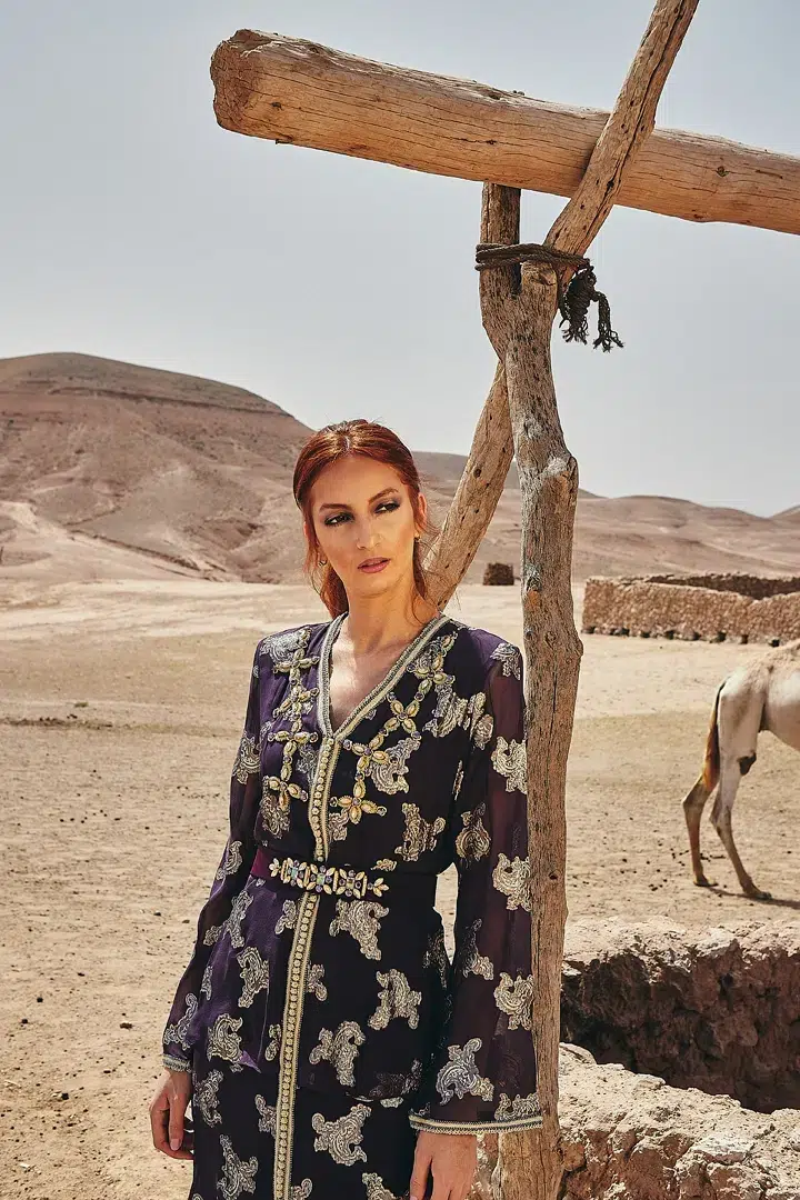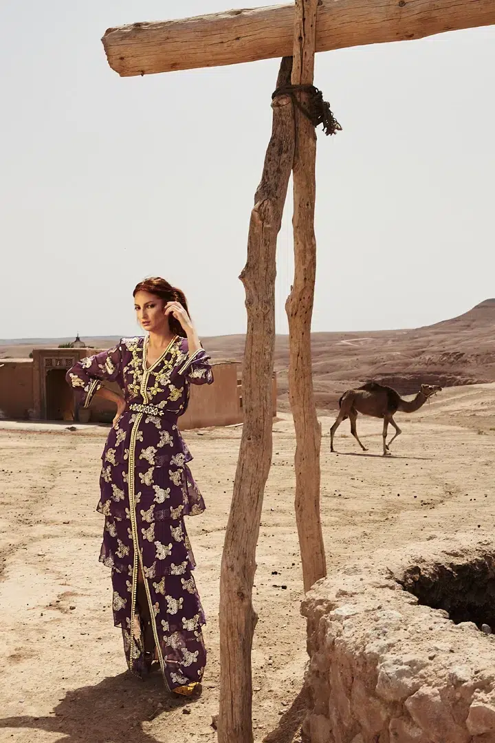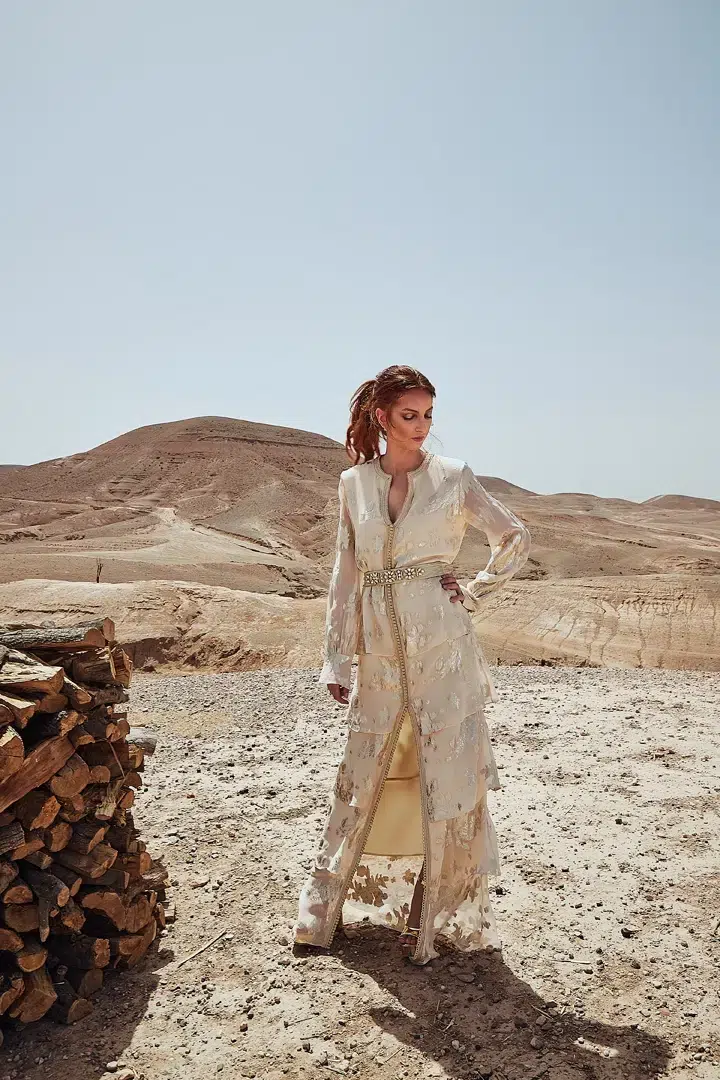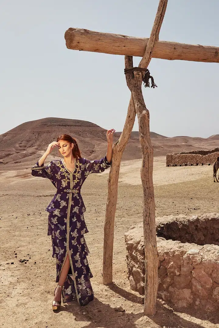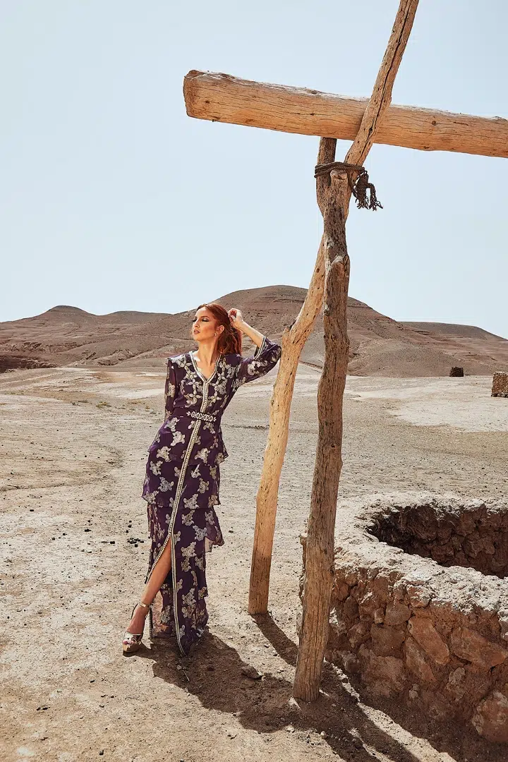 Des robes, des caftans, tenues élégantes, matières fluides, ceintures bijoux et accessoires dorés fonctionnent parfaitement. Les tons blanc, crème, beige, violet, or ressortent très bien dans le décor désertique.