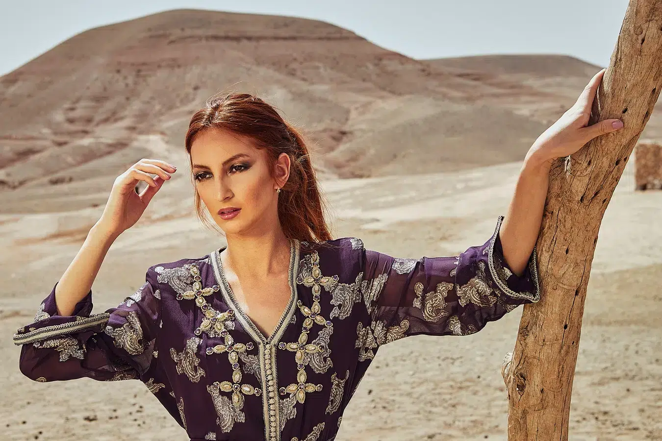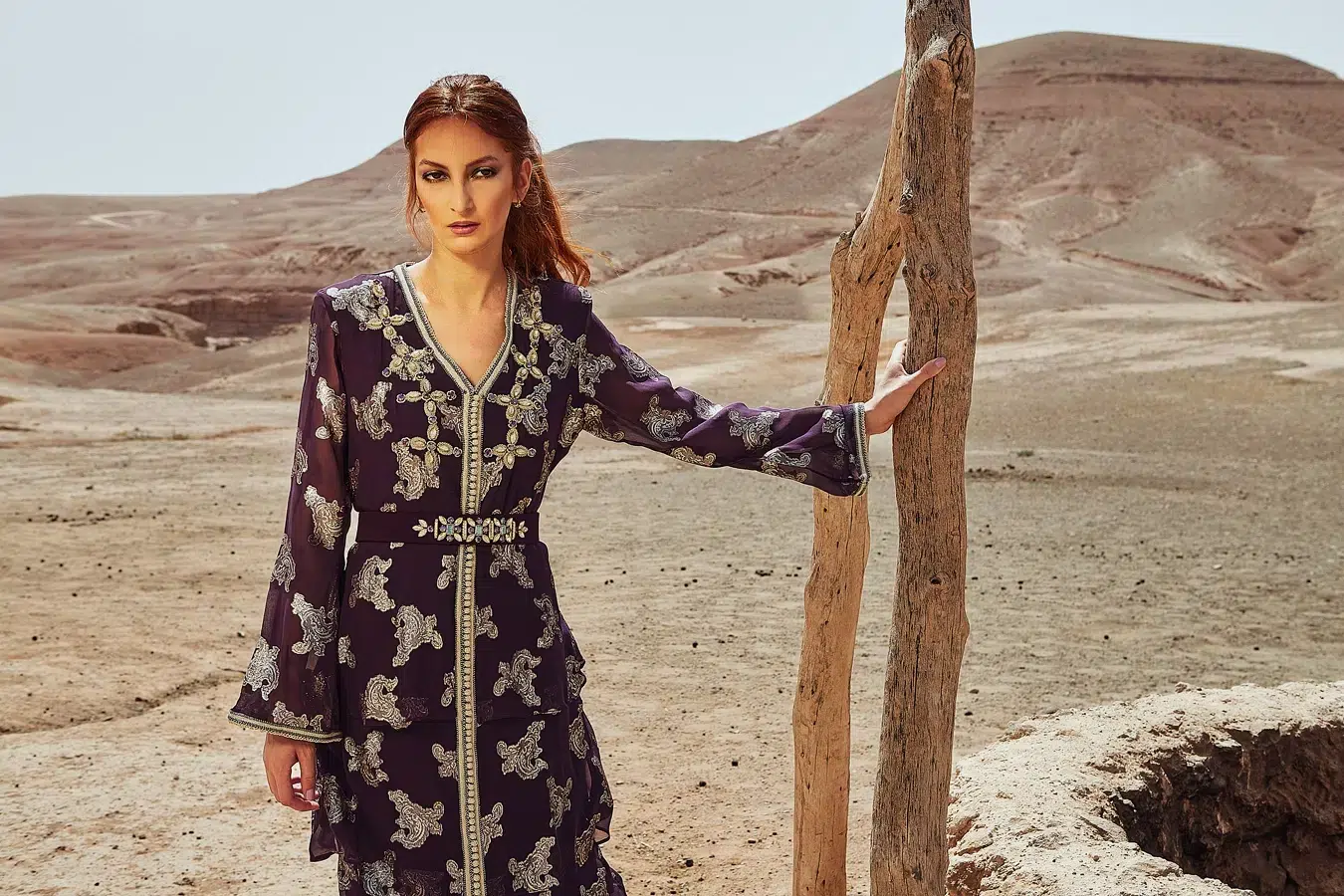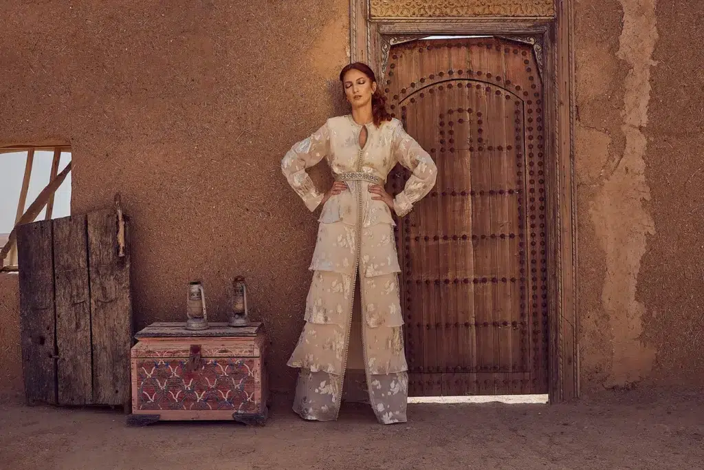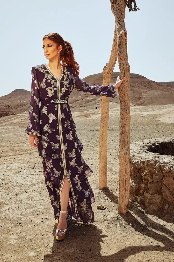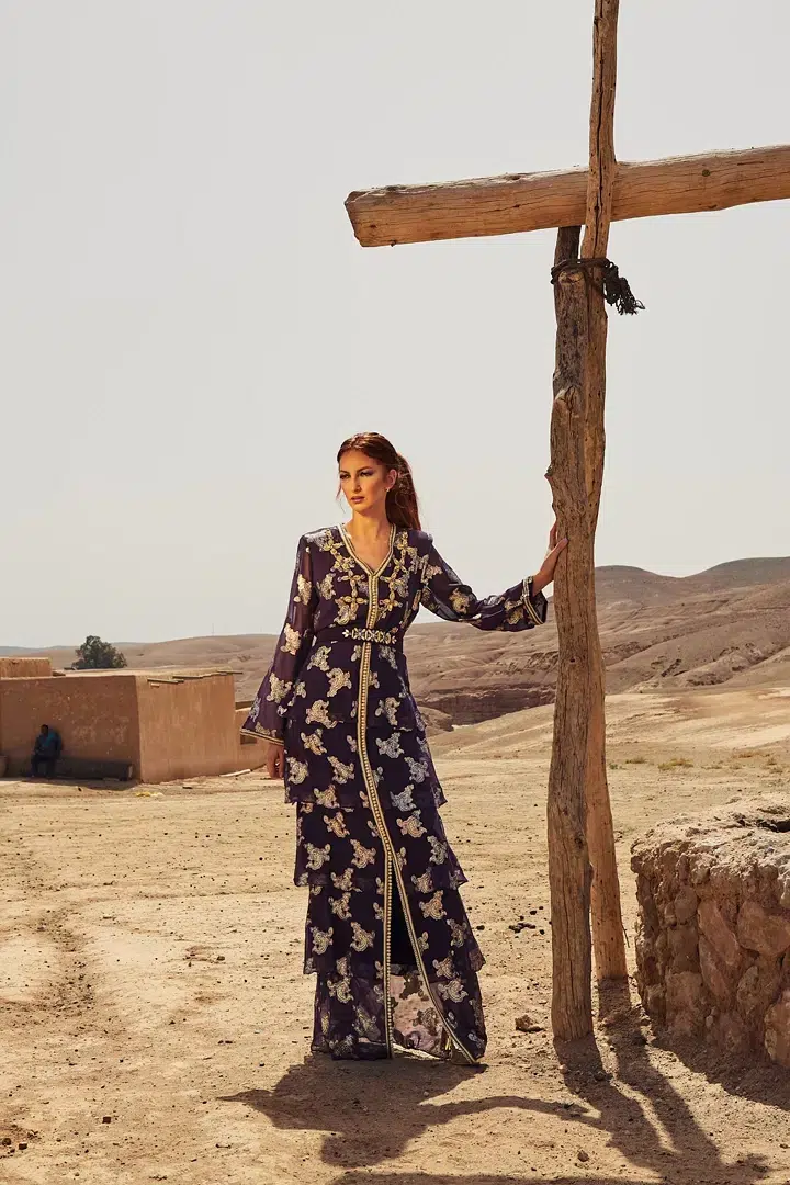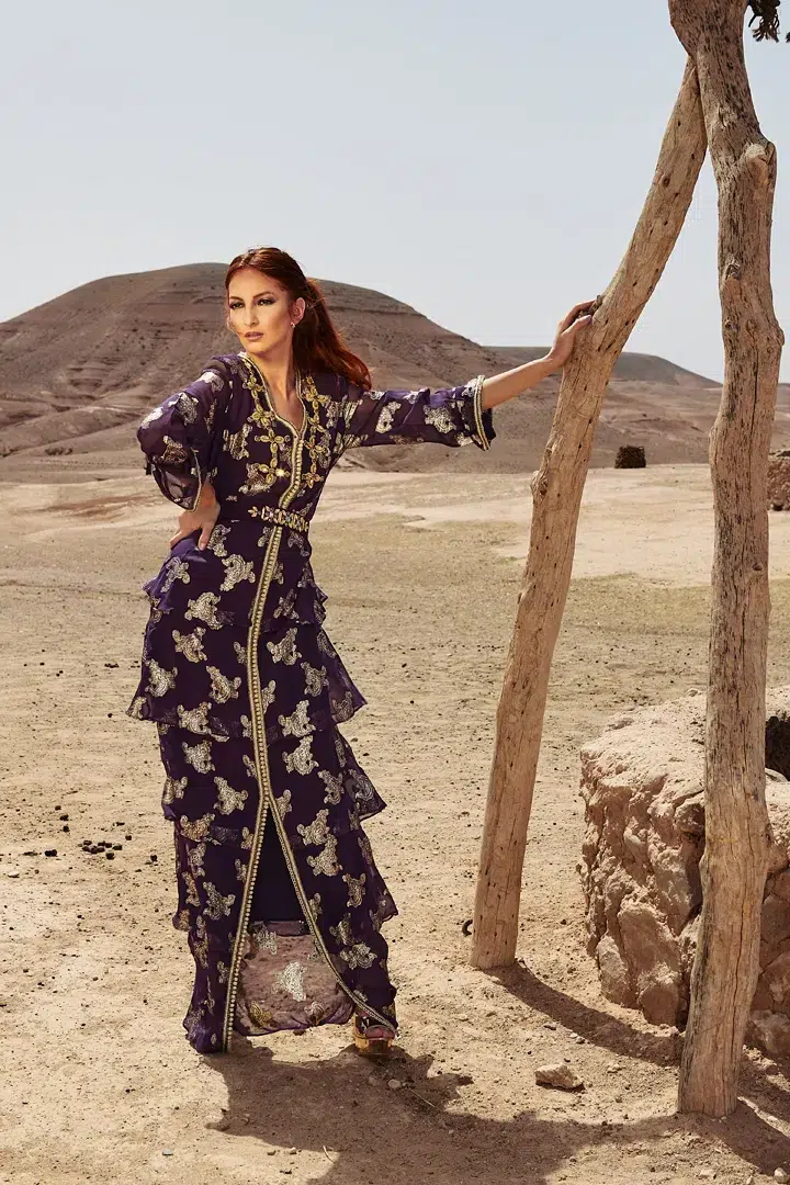 Des robes, des caftans, tenues élégantes, matières fluides, ceintures bijoux et accessoires dorés fonctionnent parfaitement. Les tons blanc, crème, beige, violet, or ressortent très bien dans le décor désertique.