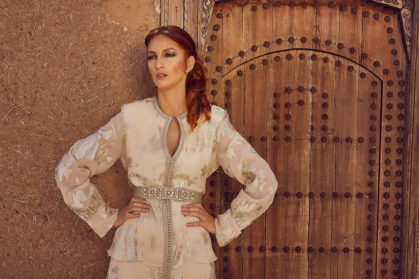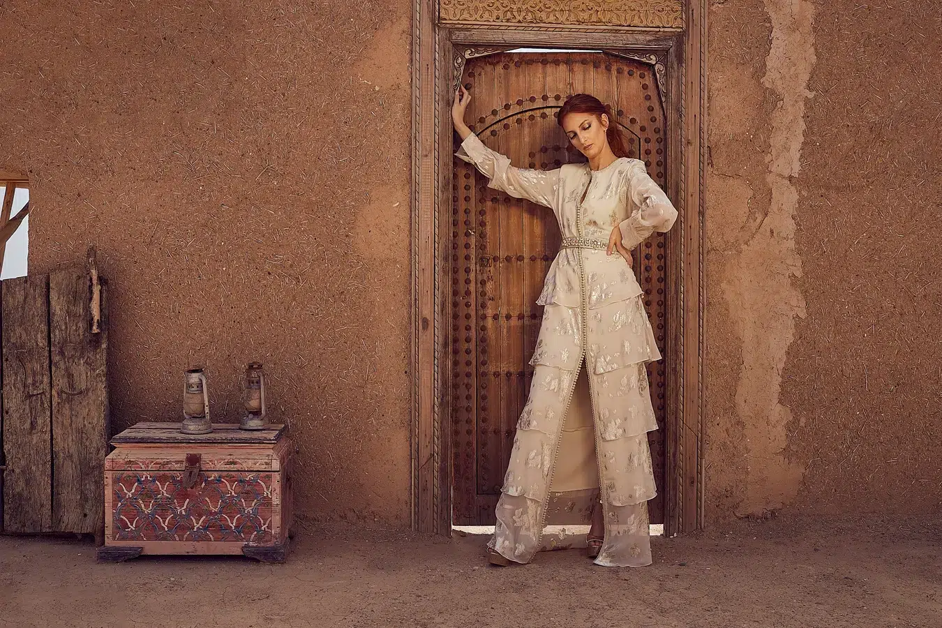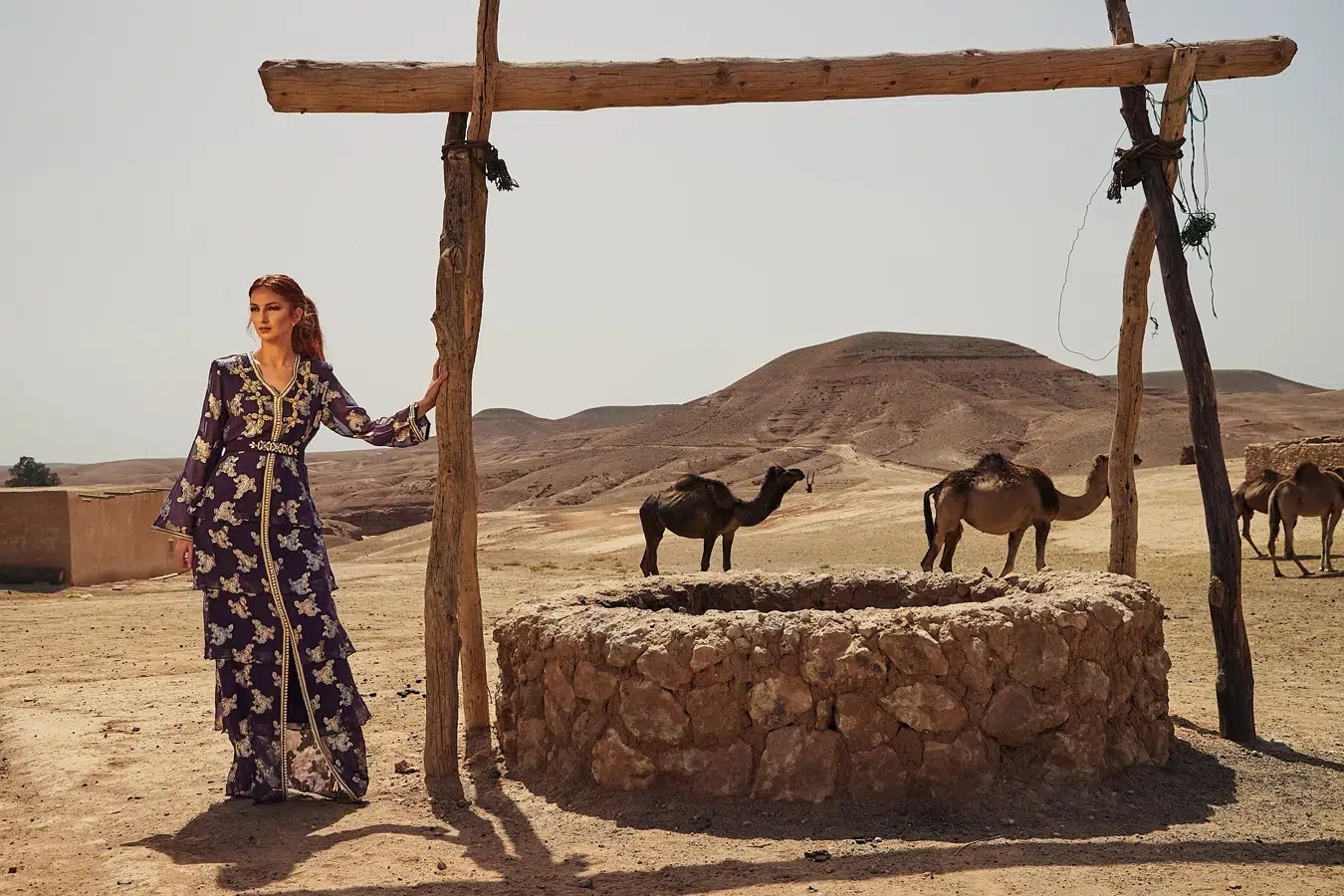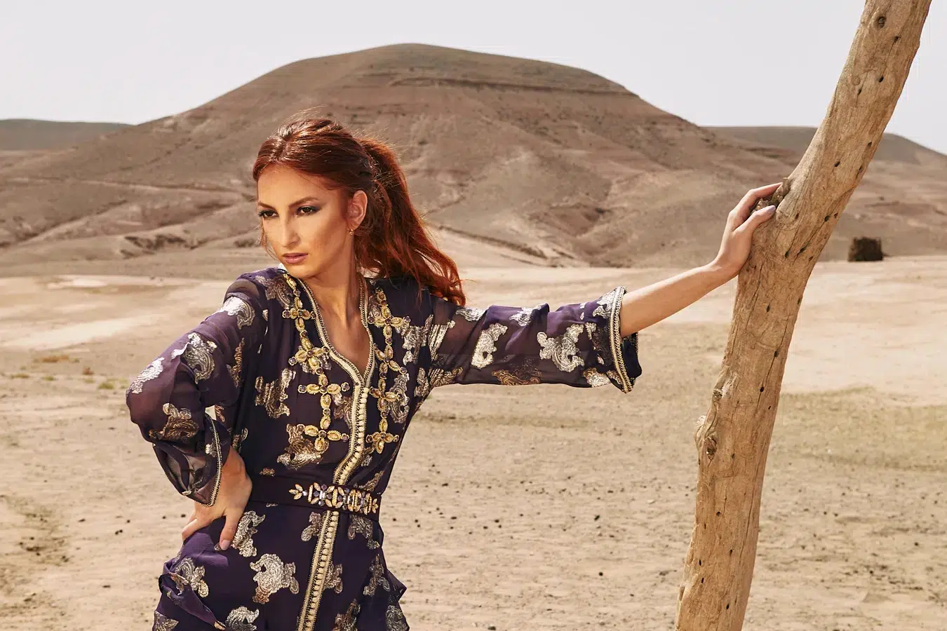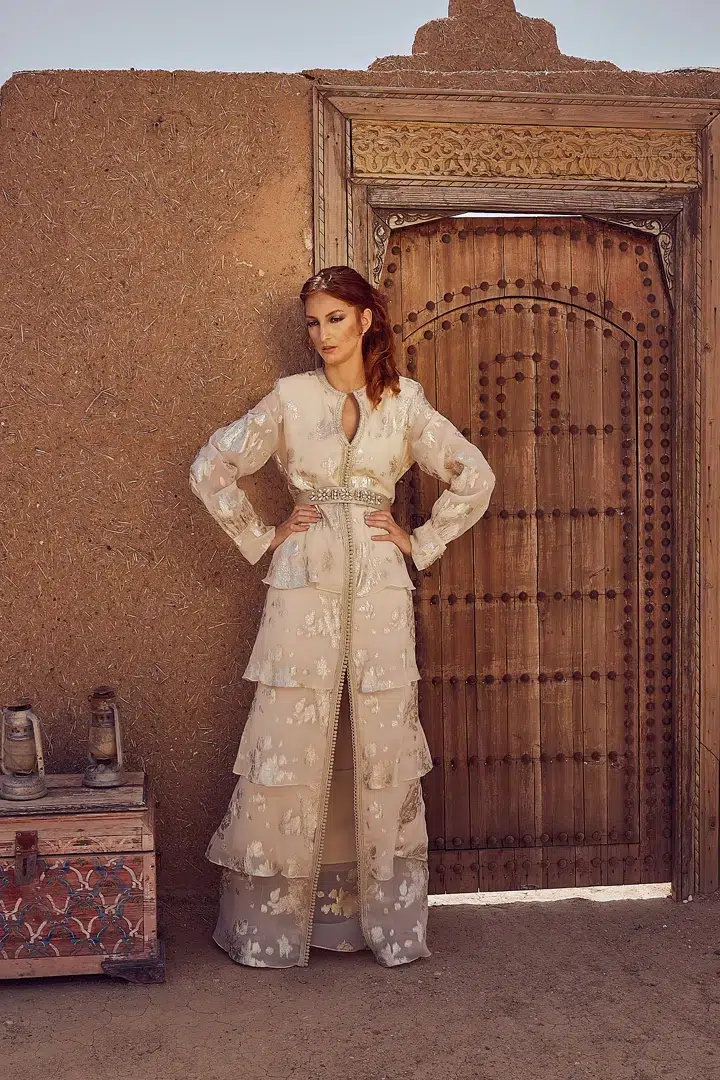 Des robes, des caftans, tenues élégantes, matières fluides, ceintures bijoux et accessoires dorés fonctionnent parfaitement. Les tons blanc, crème, beige, violet, or ressortent très bien dans le décor désertique.
