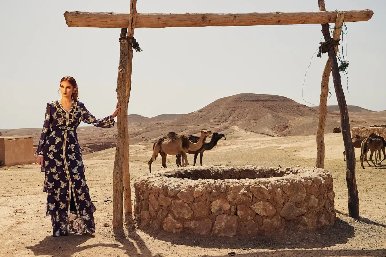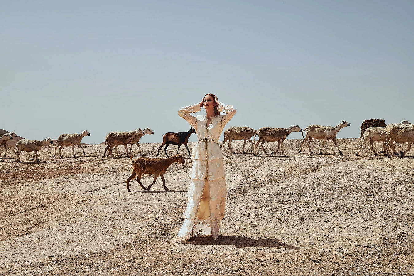 Shooting éditorial luxe & lifestyle : dunes minérales, tenues traditionnelles et lumière du désert